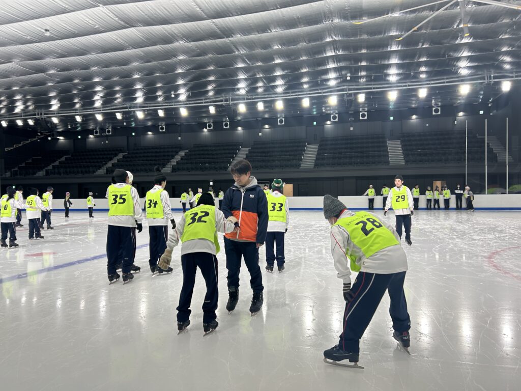 スケートはほとんどの生徒が初挑戦の中、スケート靴の履き方からインストラクターの方に教えていただきました。