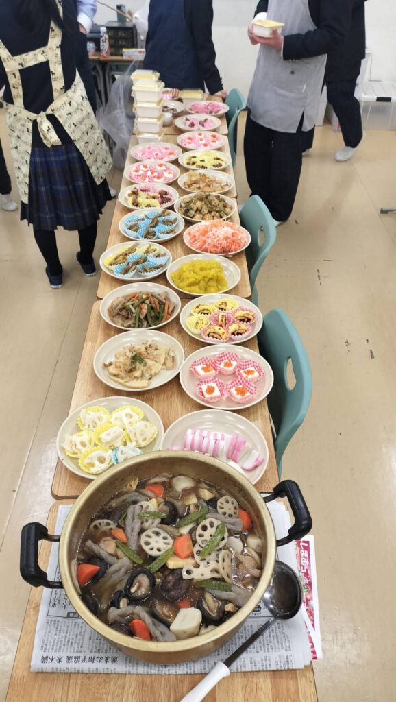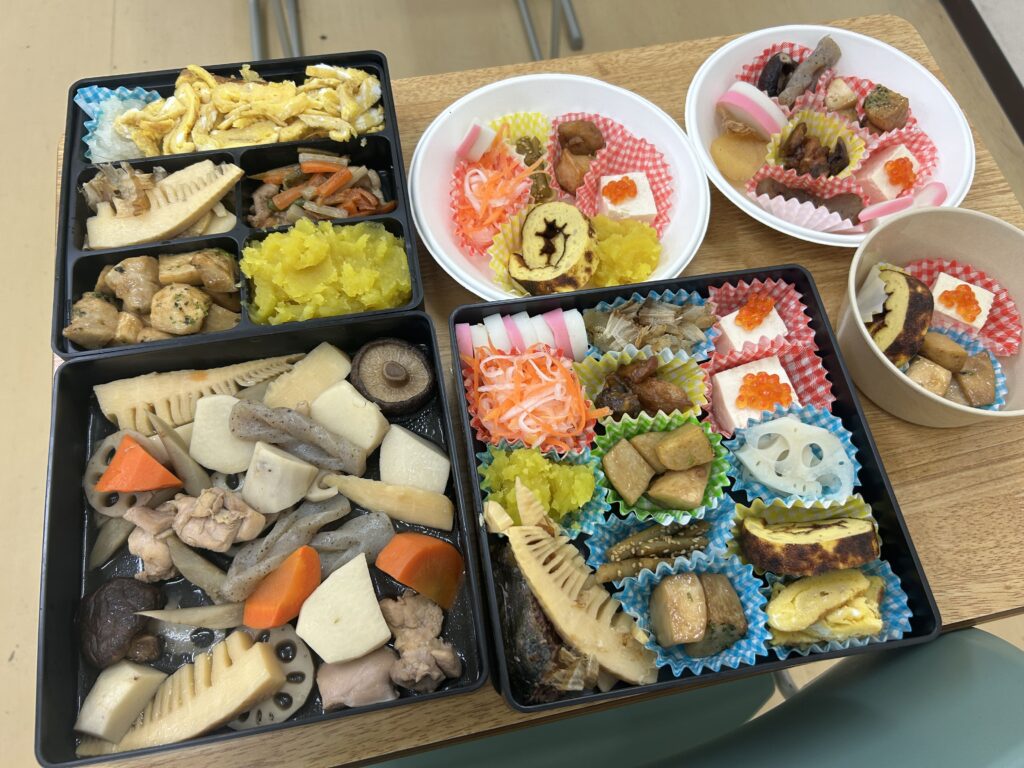 班ごとに様々な料理を作り、最後は自分のタッパーにオリジナルおせちを詰めて完成です。