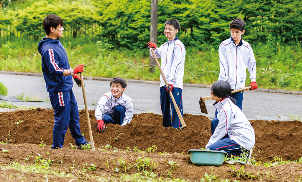 農業体験、スポーツ、アコースティックギター講座、英語で演劇、ハンドベルなどのアクティビティや、園芸、食育、カトリックなどの委員会活動を通して、周囲との人間関係を構築していきます。また、農業体験で育てた野菜を食育委員会で調理実習を行うなどの横断型の活動もあります。