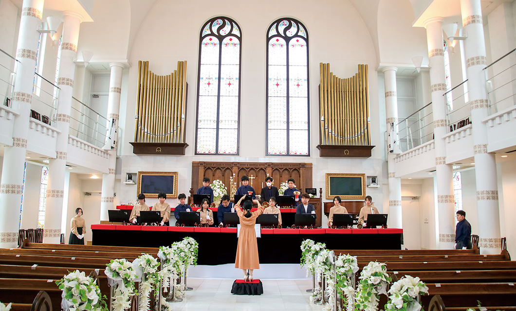 カトリックミッション校である本校では、クワイア(聖歌隊)活動を行っています。活動の内容はハンドベル演奏です。パウロ祭やクリスマスミサなどで演奏を行います。聖歌をはじめ、クラシック・映画音楽・ポップスなどに幅広くチャレンジしています。ハンドベルクワイアは学校設定科目であり、単位修得もできます。