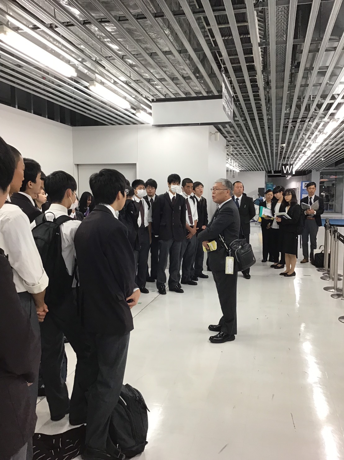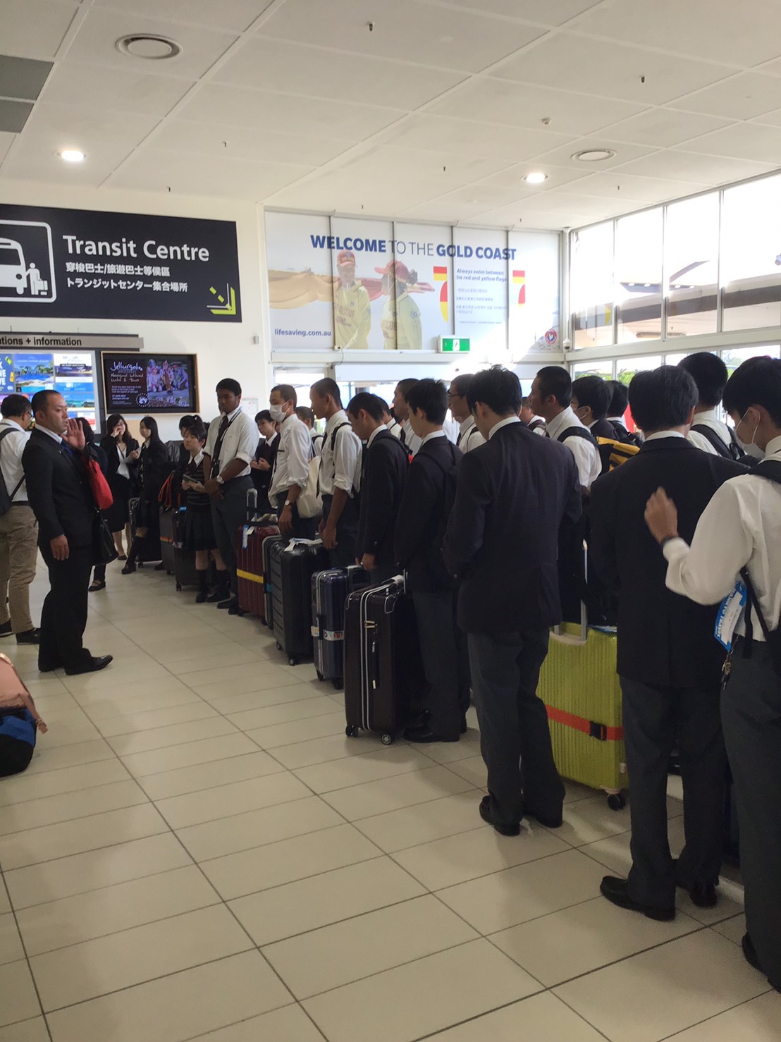 出発式を行い、いよいよ成田空港から旅立ちます。およそ9時間のフライトです。英語でのセキュリティチェックに生徒たちは緊張した表情でした。