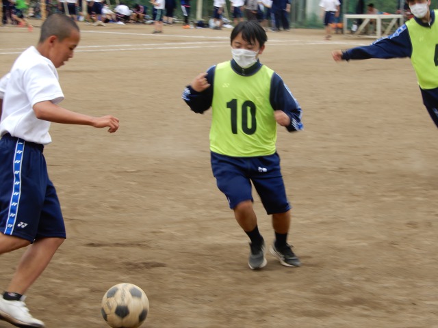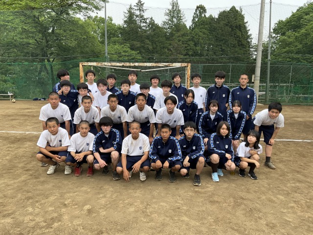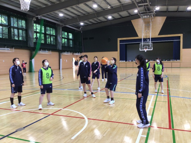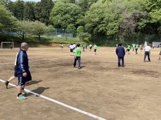 縦割りのチームで、男子はグラウンドでサッカー、女子は体育館でバスケットボールをしました。