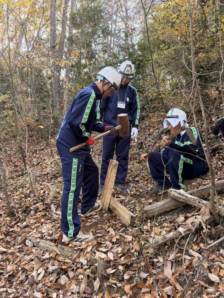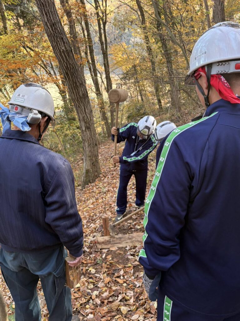 大きな木のハンマーを用いての作業はかなりの重労働。みんなで力を合わせて和やかに楽しく作業をしていました。