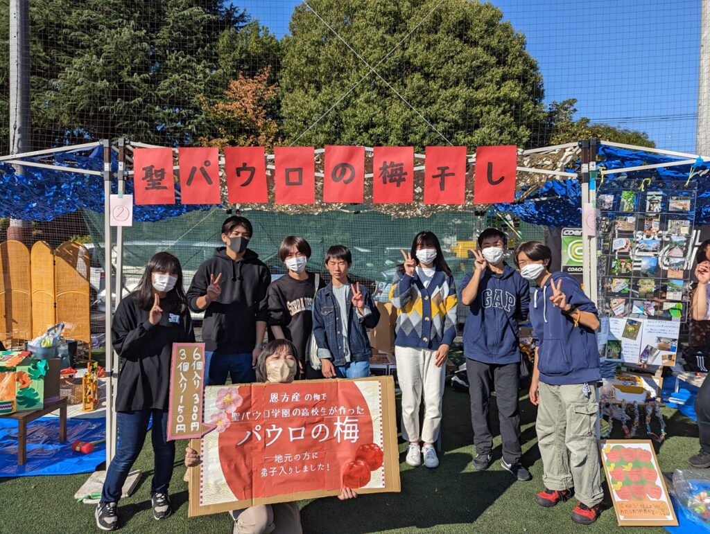 SmileChargeParkというイベントで、探究ゼミで生徒達が漬けた梅干しを販売しています。パッケージのシールが赤のものと青のものの2種類を並べ、どちらが多く手に取られ売れるのかをテーマにしている生徒が、インタビューもしながら売っています。