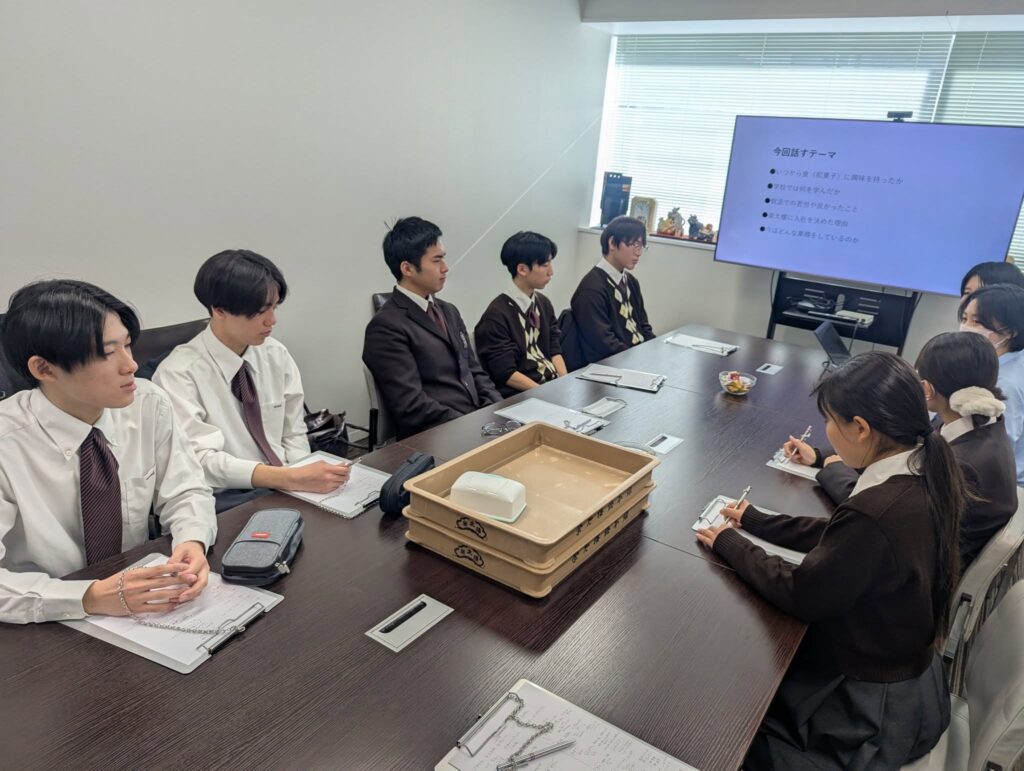 その後、若手社員の方のお話を聞き、生徒達からの質問に答えていただきます。商品開発や品質管理について、色々とお聞きし、生徒達は和菓子作りに様々な角度から触れ、考えることができる機会となりました。