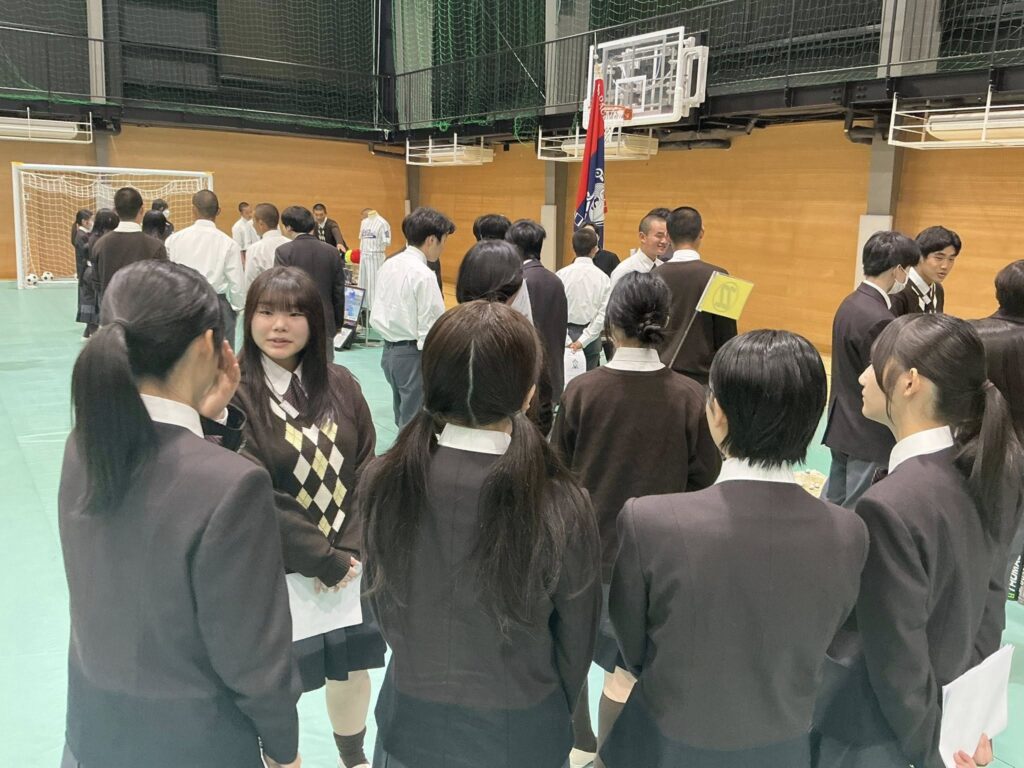 体育館で、ハンドベル部、吹奏楽部、系音楽部、ダンス部のパフォーマンスの後、上級生と新入生の入り混じった小グループで、移動します。