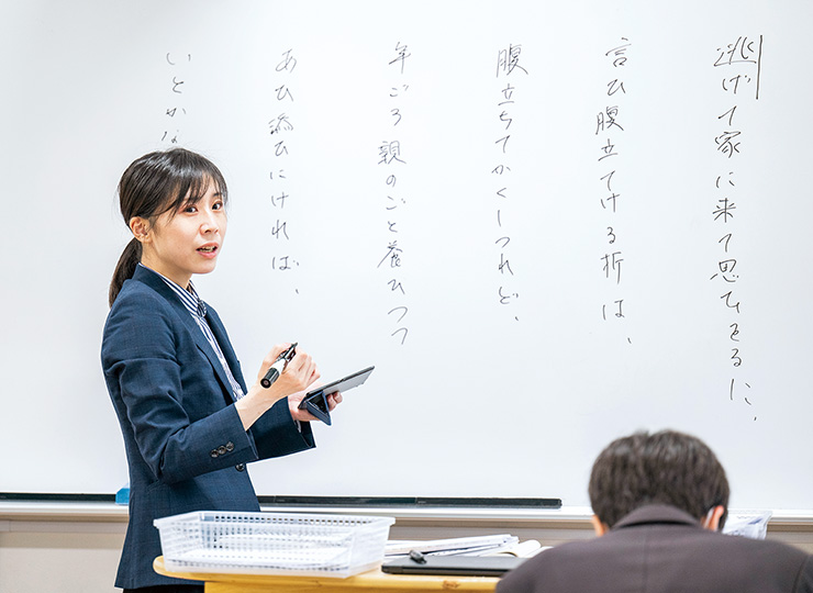本校ではプレゼンテーションや小論文などを通して、自分の考えをまとめ、発表する機会を多く設けています。漢字や古典文法、読解といった基礎学力はもちろん大切ですが、国語の学びを通して現代社会の出来事に関心を持って検討し、そしてそれを他者に伝える力を身につけてほしいと願っています。教科書だけでなく、ニュースや読書を通じて、知的好奇心を持って学びを深めていくこと促していきます。